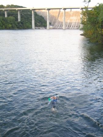 The Friday night open water swim has become a bit of tradition this past summer. Meet up with friends after work on Friday night, Zen swim for ½ hour, head off to Whole Foods for dinner. Everything about it seems perfect but our warm Austin summer began to make the swim a bit too much for our delicate equilibriums. In an effort to acclimate to the colder waters, Lynne set out in search of a new location for our tradition; the low water crossing, just past Mansfield Dam.